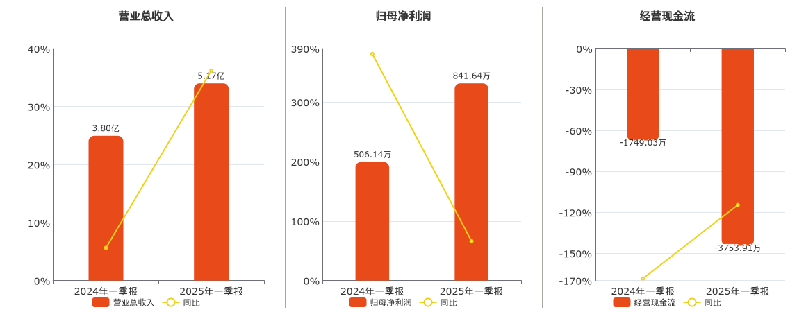 公司营业总收入为5.17亿元。归母净利润为841.64万元。经营活动现金净流入为-3753.91万元,较去年同报告期经营活动现金净流入减少2004.88万元。