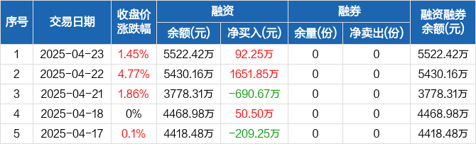融资方面,当日融资买入3844.93万元,融资偿还3752.67万元,融资净买入92.25万元。融券方面,融券卖出0份,融券偿还0份,融券余量0份,融券余额0元。融资融券余额合计5522.42万元。