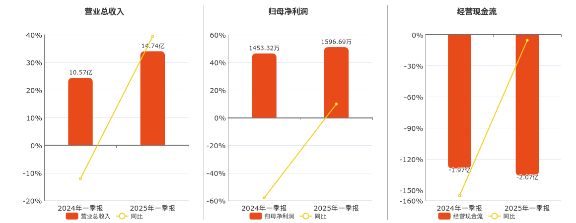公司营业总收入为14.74亿元。归母净利润为1596.69万元。经营活动现金净流入为-2.07亿元,较去年同报告期经营活动现金净流入减少1056.28万元。