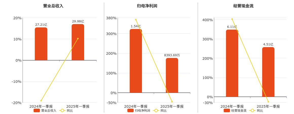 公司营业总收入为29.98亿元,较去年同报告期营业总收入增加2.77亿元,同比较去年同期上涨10.17%。归母净利润为8393.69万元,较去年同报告期归母净利润减少7011.47万元,同比较去年同期下降45.51%。经营活动现金净流入为4.51亿元,较去年同报告期经营活动现金净流入减少1.60亿元,同比较去年同期下降26.11%。