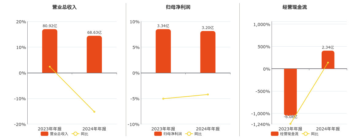 公司营业总收入为68.63亿元,在已披露的同业公司中排名第11,较去年同报告期营业总收入减少12.29亿元,同比较去年同期下降15.19%。归母净利润为3.20亿元,在已披露的同业公司中排名第10,较去年同报告期归母净利润减少1412.91万元,同比较去年同期下降4.23%。经营活动现金净流入为2.34亿元,在已披露的同业公司中排名第8,较去年同报告期经营活动现金净流入增加8.42亿元。