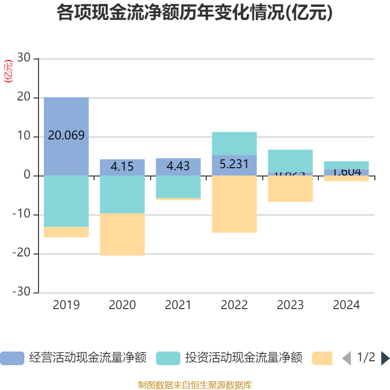 截至2024年,公司经营活动现金流净额为1.6亿元,同比增长94.56%;筹资活动现金流净额-1.46亿元,同比增加5.31亿元;投资活动现金流净额2.04亿元,上年同期为5.8亿元。