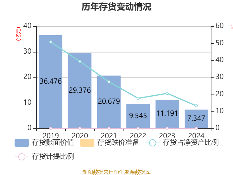 从存货变动来看,截至2024年末,公司存货账面价值为7.35亿元,占净资产的13.27%,较上年末减少3.84亿元。公司本期没有计提存货跌价准备。
