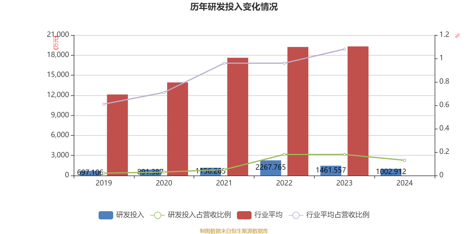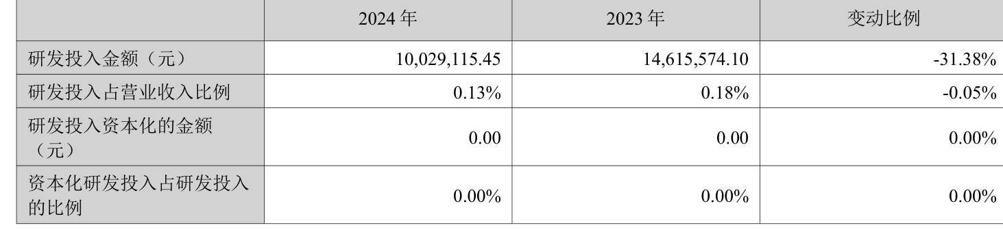 2024年全年,公司研发投入金额为1002.91万元,同比下降31.38%;研发投入占营业收入比例为0.13%,相比上年同期下降0.05个百分点。此外,公司全年研发投入资本化率为0%。