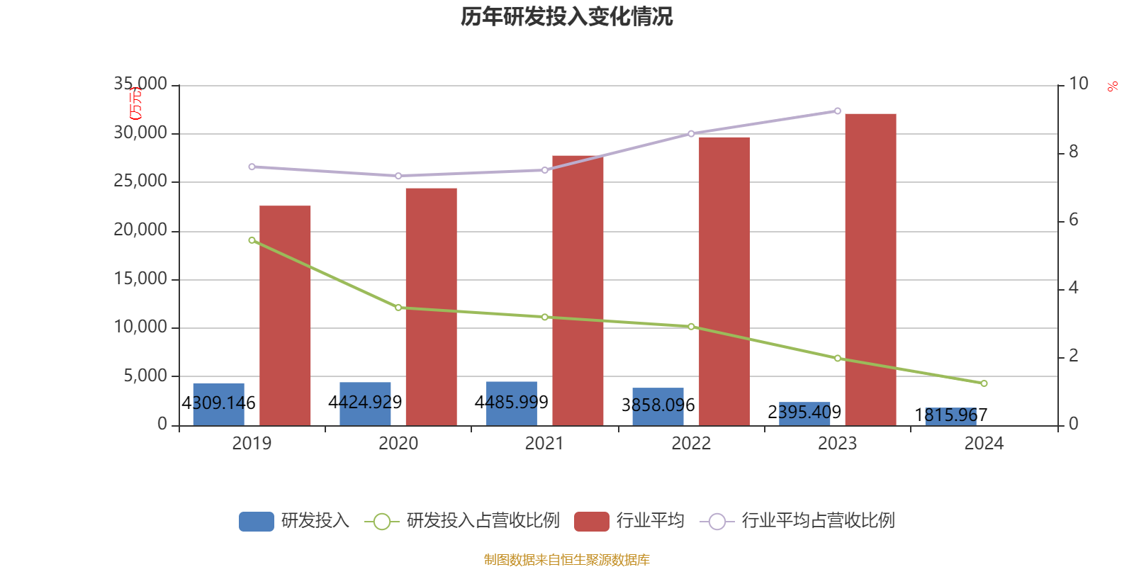 2024年全年,公司研发投入金额为1815.97万元,同比下降24.19%;研发投入占营业收入比例为1.23%,相比上年同期下降0.74个百分点。此外,公司全年研发投入资本化率为0%。