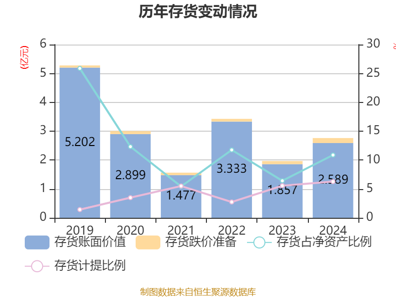 从存货变动来看,截至2024年末,公司存货账面价值为2.59亿元,占净资产的10.87%,较上年末增加7316.61万元。其中,存货跌价准备为1730.76万元,计提比例为6.27%。
