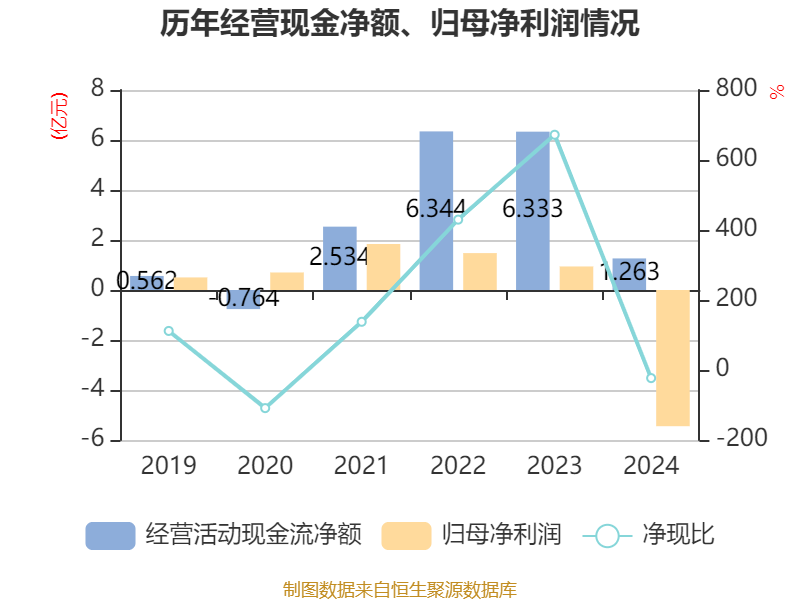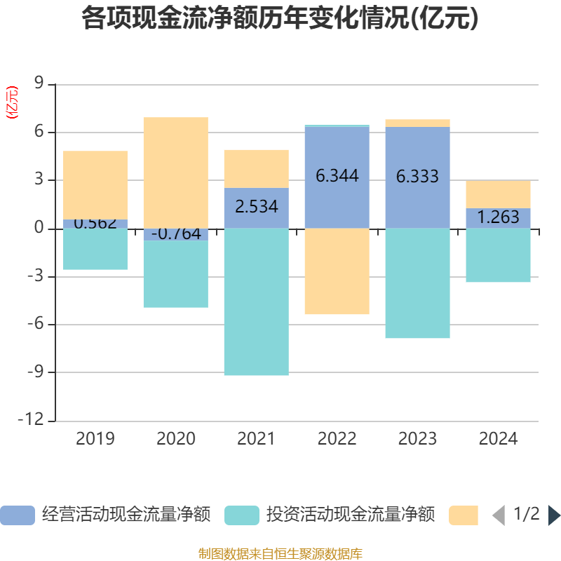 截至2024年,公司经营活动现金流净额为1.26亿元,同比下降80.06%;筹资活动现金流净额1.7亿元,同比增加1.23亿元;投资活动现金流净额-3.35亿元,上年同期为-6.85亿元。