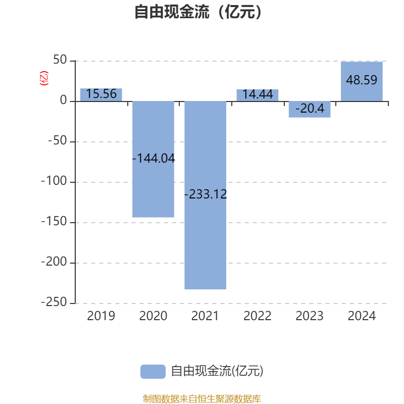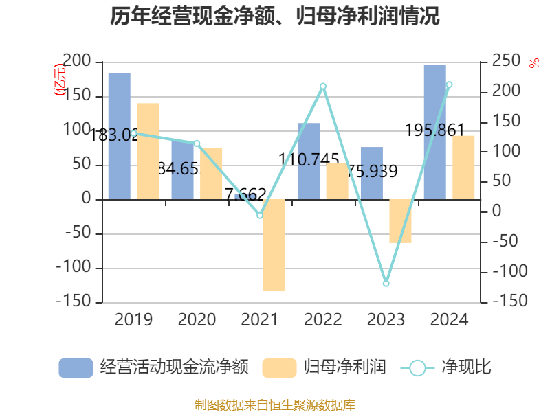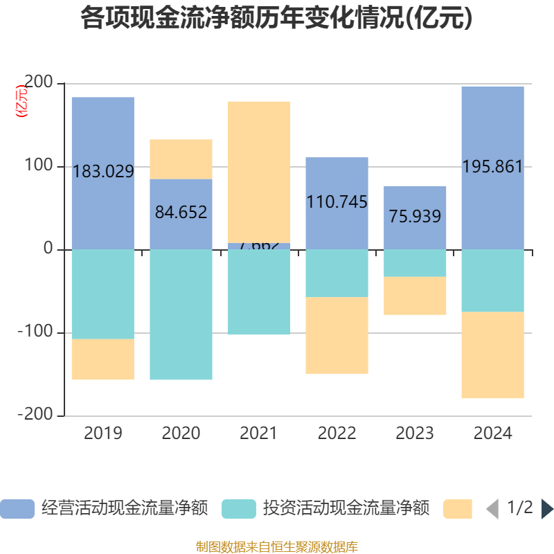 截至2024年,公司经营活动现金流净额为195.86亿元,同比增长157.92%;筹资活动现金流净额-103.78亿元,同比减少58.02亿元;投资活动现金流净额-75.46亿元,上年同期为-33.15亿元。