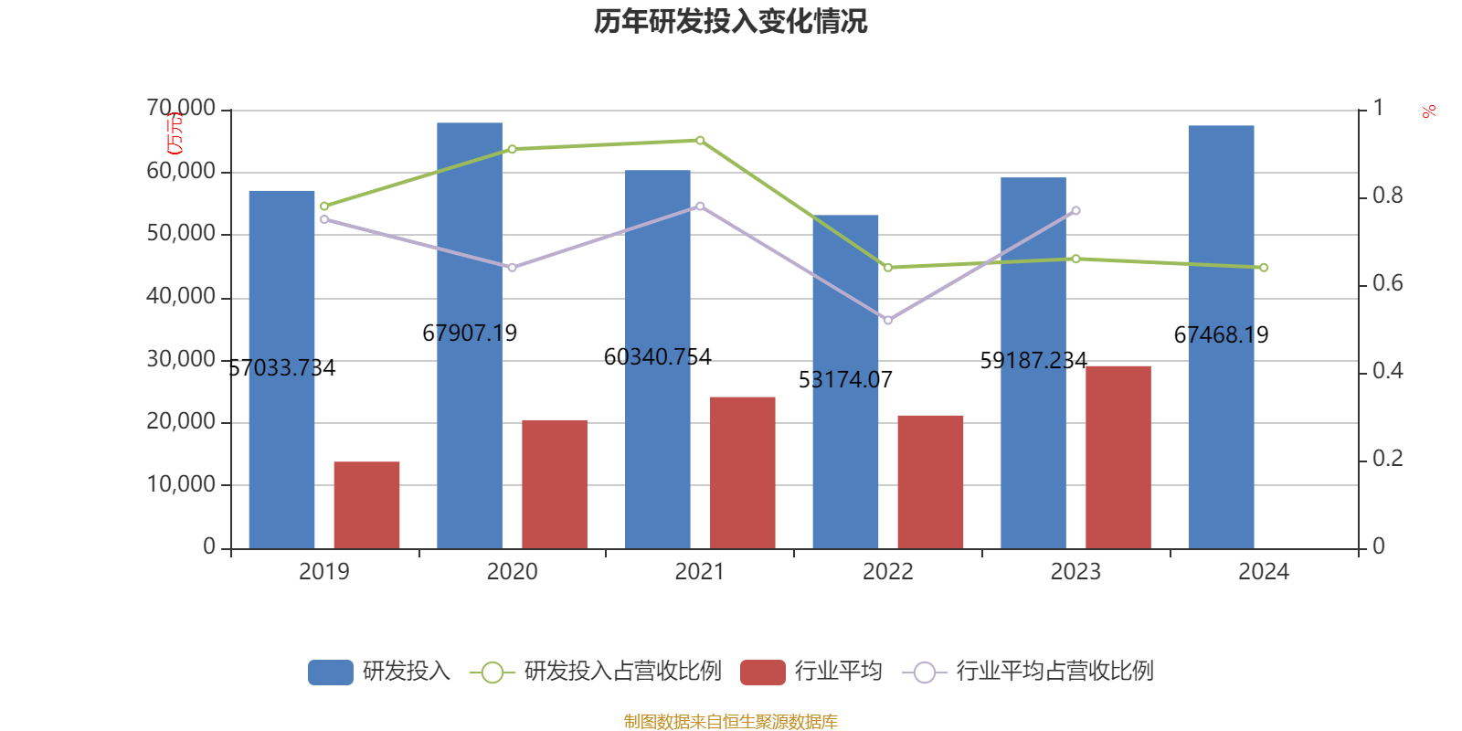 2024年全年,公司研发投入金额为6.75亿元,同比增长13.99%;研发投入占营业收入比例为0.64%,相比上年同期下降0.02个百分点。此外,公司全年研发投入资本化率为0%。