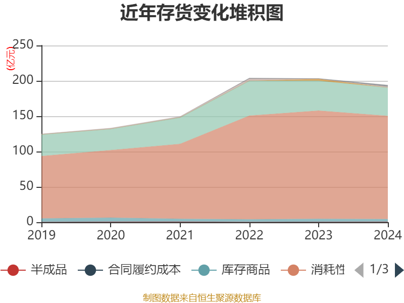 从存货变动来看,截至2024年末,公司存货账面价值为194.01亿元,占净资产的47.37%,较上年末减少9.35亿元。其中,存货跌价准备为1567.54万元,计提比例为0.08%。