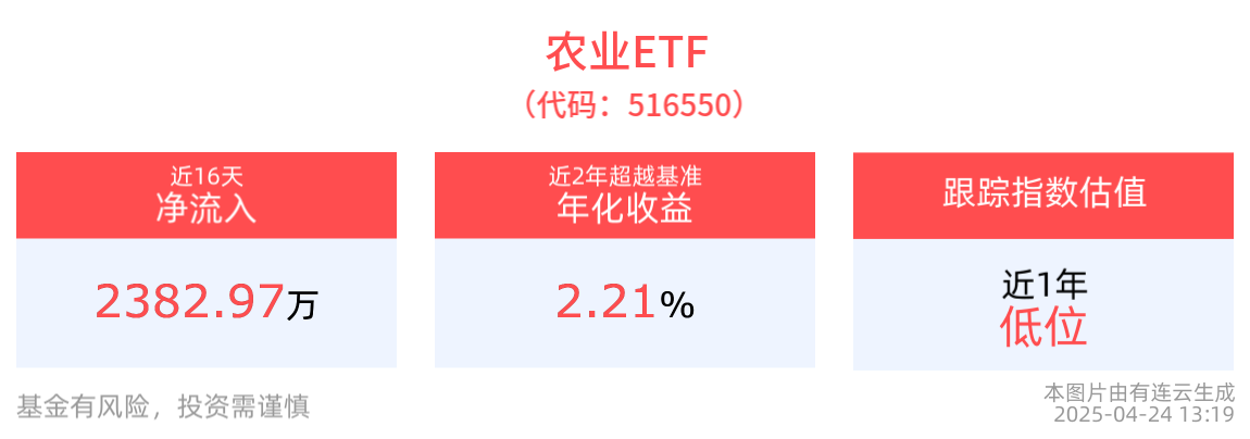 流动性方面,农业ETF盘中换手2.99%,成交710.20万元。资金流入方面,拉长时间看,农业ETF近16个交易日内,合计“吸金”2382.97万元。