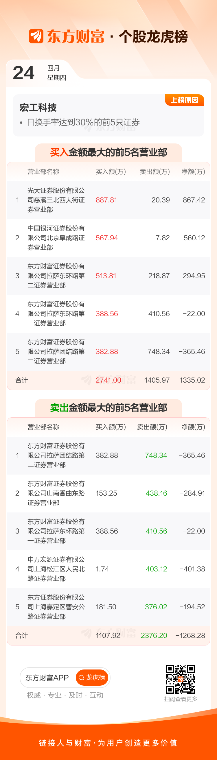 交易所2025年4月24日公布的交易公开信息显示,宏工科技因成为日换手率达到30%的前5只证券上榜。宏工科技当日收报55.68元,涨跌幅-9.03%,偏离值35.93%,换手率35.93%,成交额3.26亿。