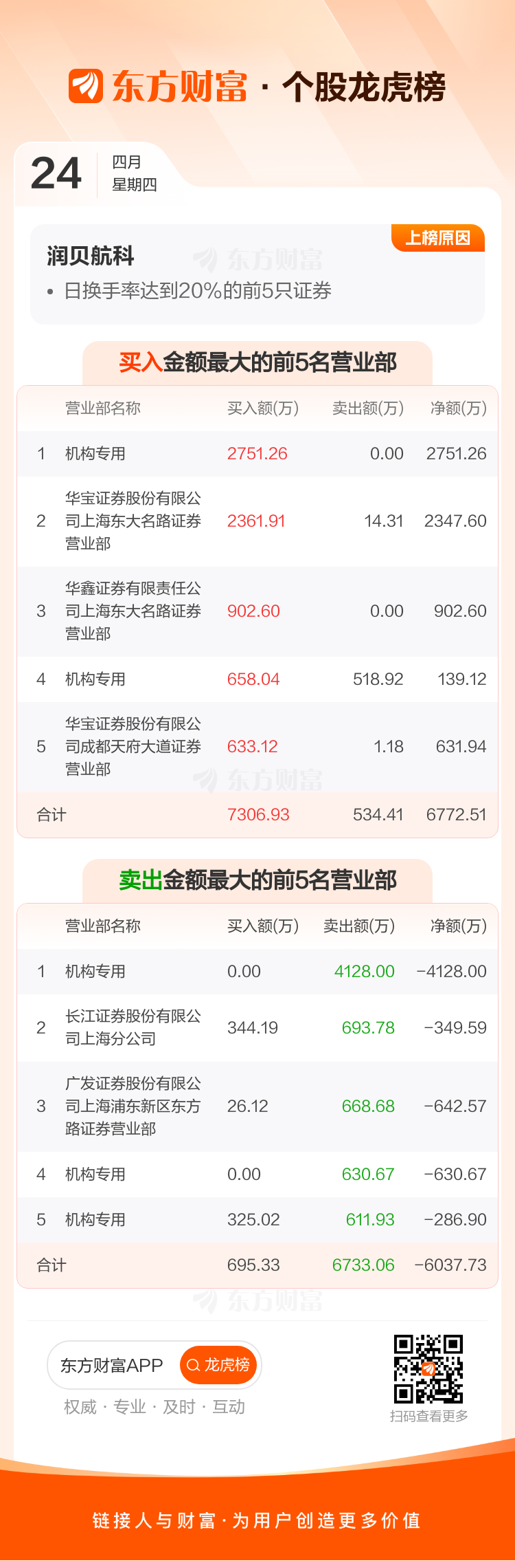 交易所2025年4月24日公布的交易公开信息显示,润贝航科因成为日换手率达到20%的前5只证券上榜。润贝航科当日收报41.28元,涨跌幅9.99%,偏离值44.44%,换手率44.58%,成交额4.72亿。