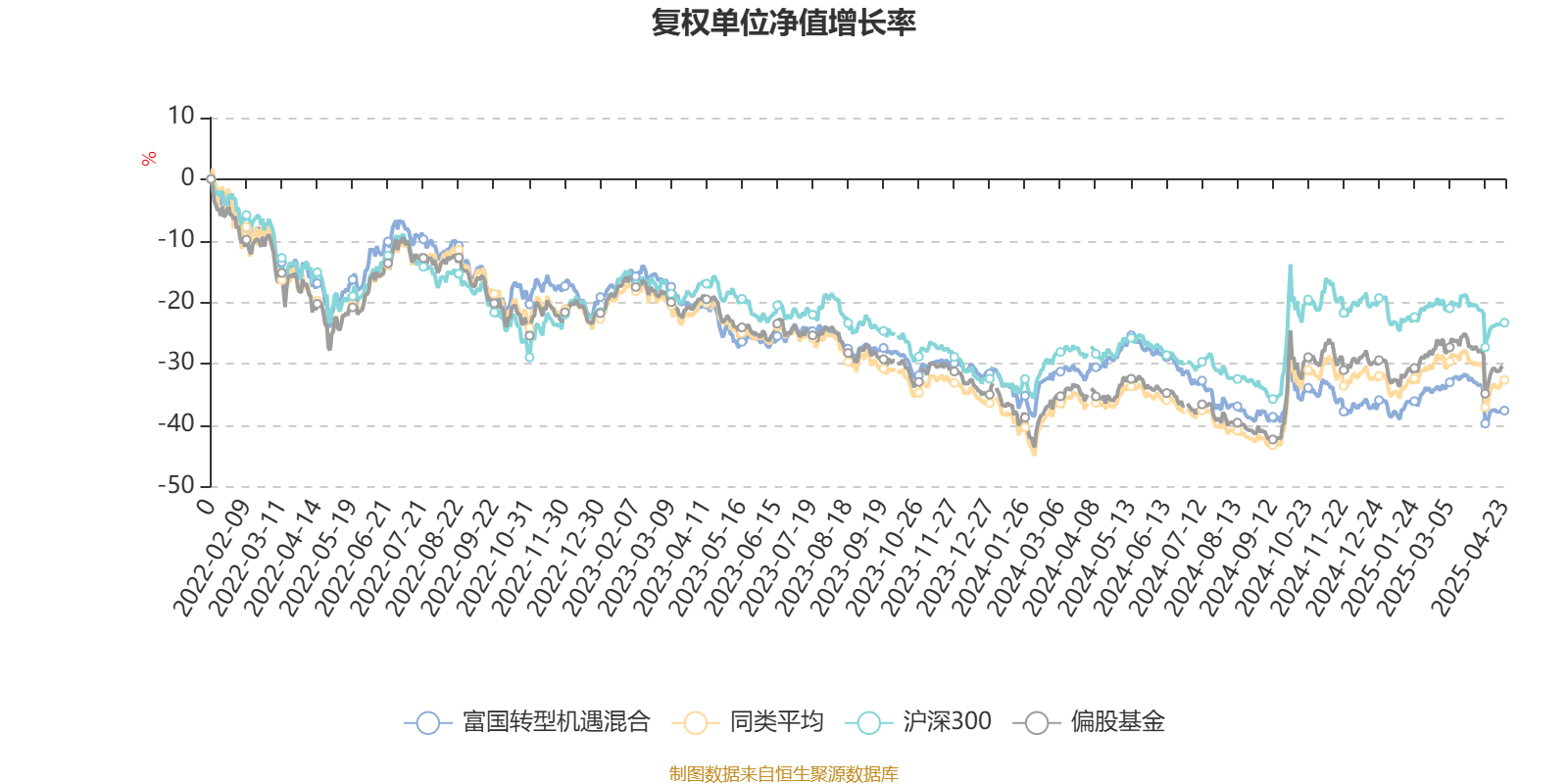 截至4月23日,富国转型机遇混合近三个月复权单位净值增长率为-1.66%,位于同类可比基金151/210;近半年复权单位净值增长率为-5.62%,位于同类可比基金155/209;近一年复权单位净值增长率为-11.41%,位于同类可比基金204/209;近三年复权单位净值增长率为-21.83%,位于同类可比基金163/196。
