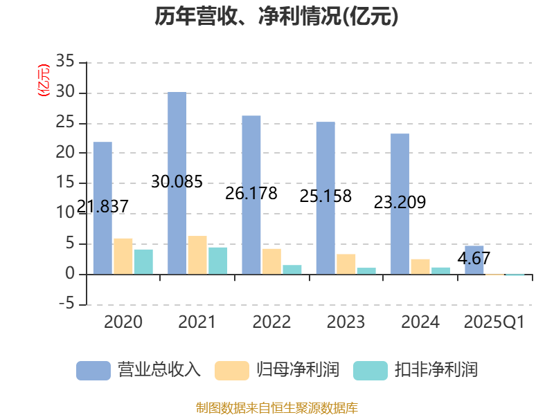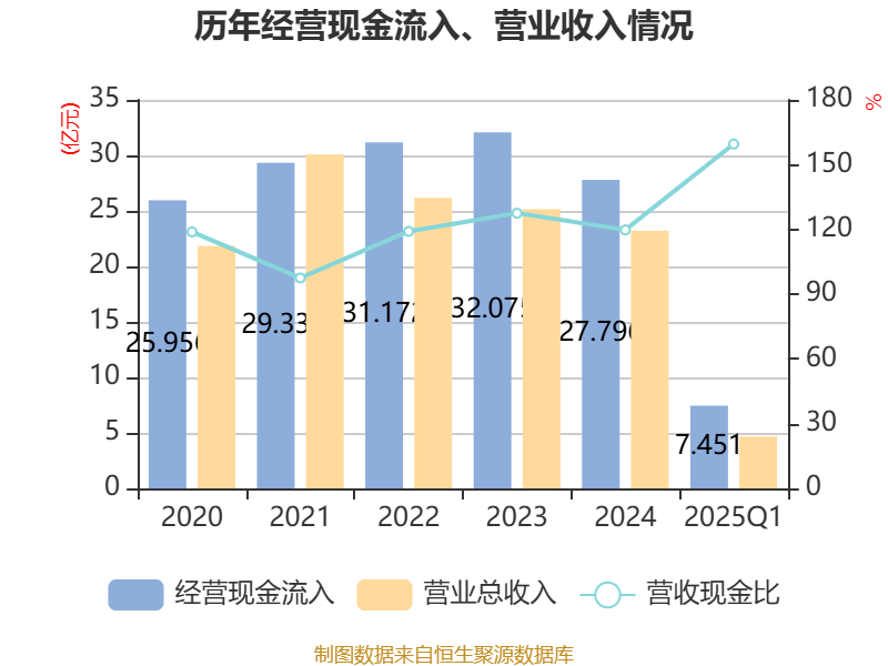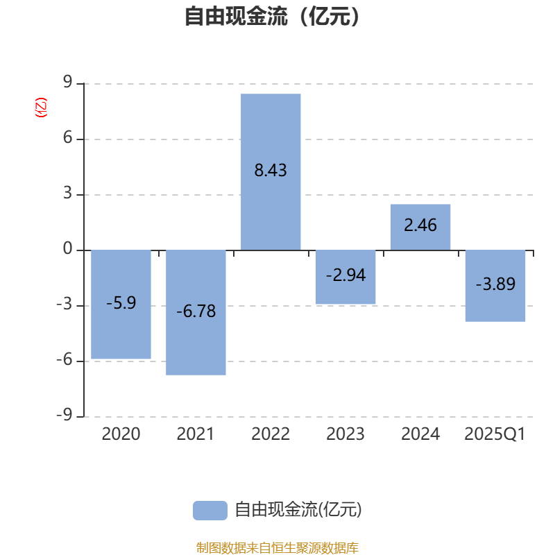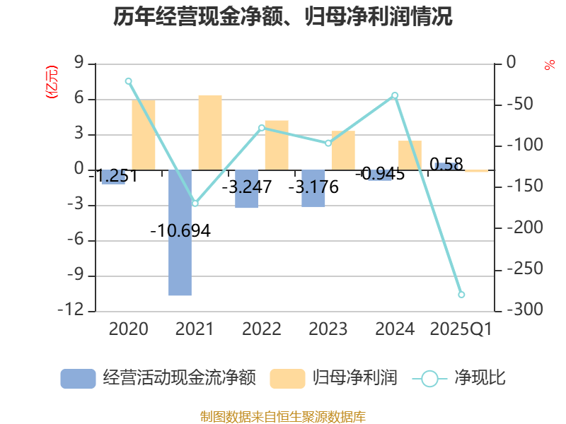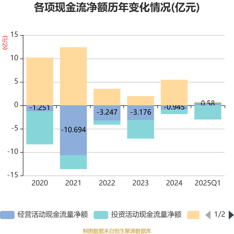 截至2025年一季度末,公司经营活动现金流净额为5801.9万元,同比增加2.23亿元;筹资活动现金流净额1558.9万元,同比减少2.3亿元;投资活动现金流净额-3.03亿元,上年同期为-2.81亿元。