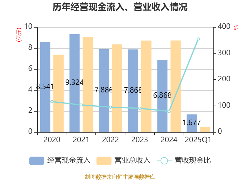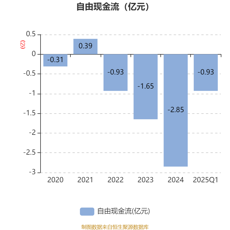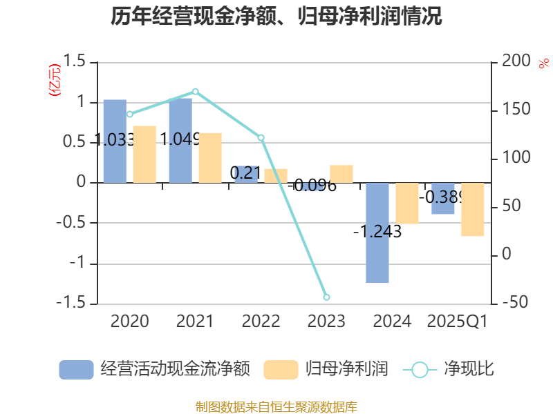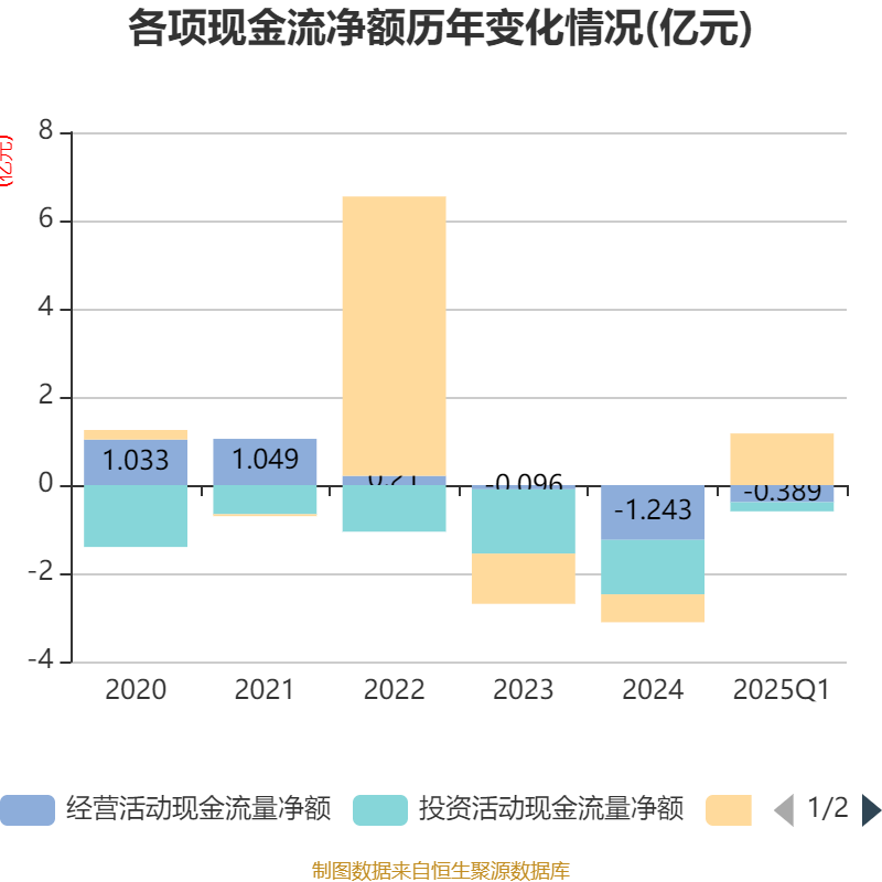 截至2025年一季度末,公司经营活动现金流净额为-3891.12万元,同比减少1366.27万元;筹资活动现金流净额1.17亿元,同比增加1.63亿元;投资活动现金流净额-2062.8万元,上年同期为-2728.2万元。