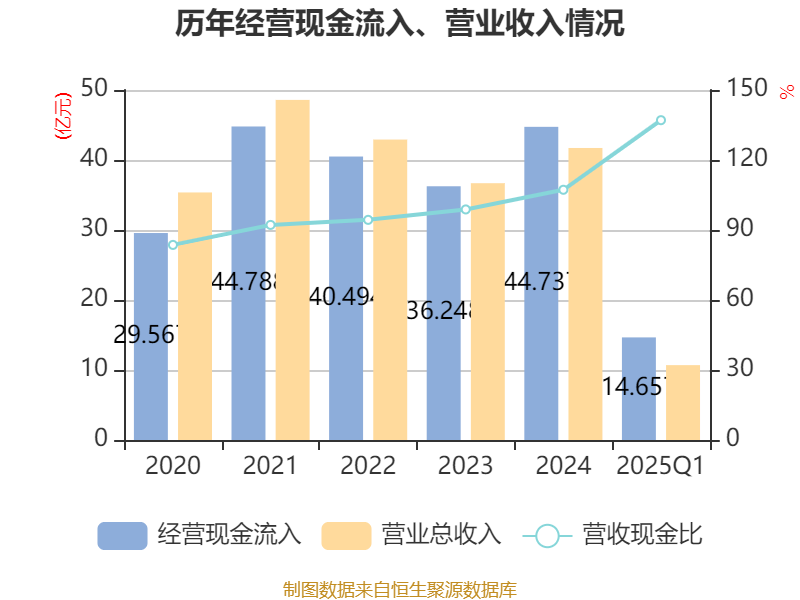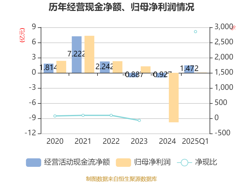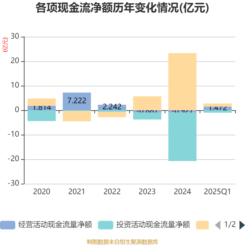 截至2025年一季度末,公司经营活动现金流净额为1.47亿元,同比增加2.58亿元;筹资活动现金流净额1.29亿元,同比减少4.52亿元;投资活动现金流净额-9948.31万元,上年同期为-6.82亿元。