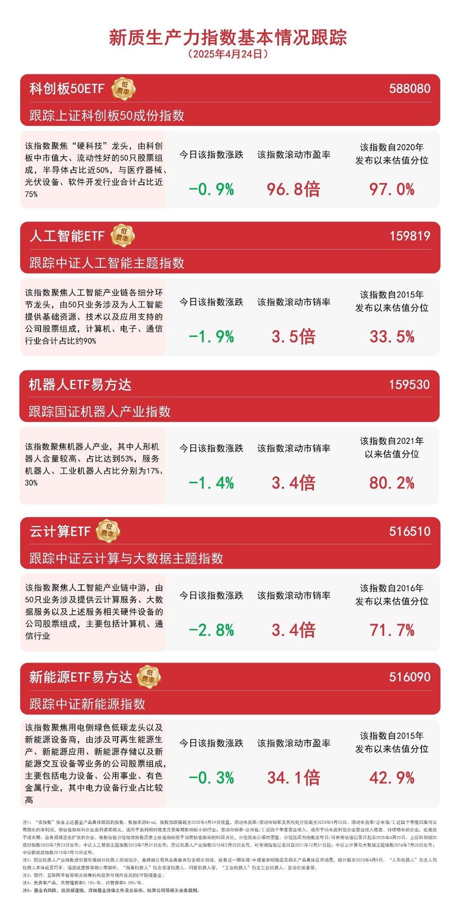 截至收盘,中证新能源指数下跌0.3%,上证科创板50成份指数下跌0.9%,国证机器人产业指数下跌1.4%,中证人工智能主题指数下跌1.9%,中证云计算与大数据主题指数下跌2.8%。
