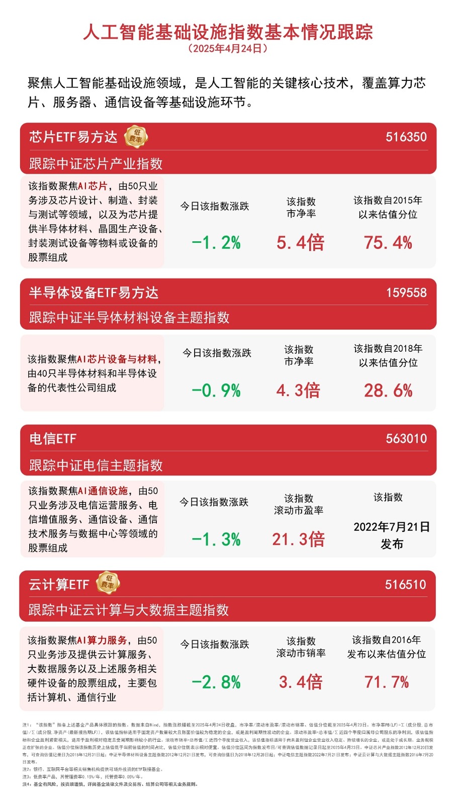 截至收盘,中证半导体材料设备主题指数下跌0.9%,中证芯片产业指数下跌1.2%,中证电信主题指数下跌1.3%,中证云计算与大数据主题指数下跌2.8%。
