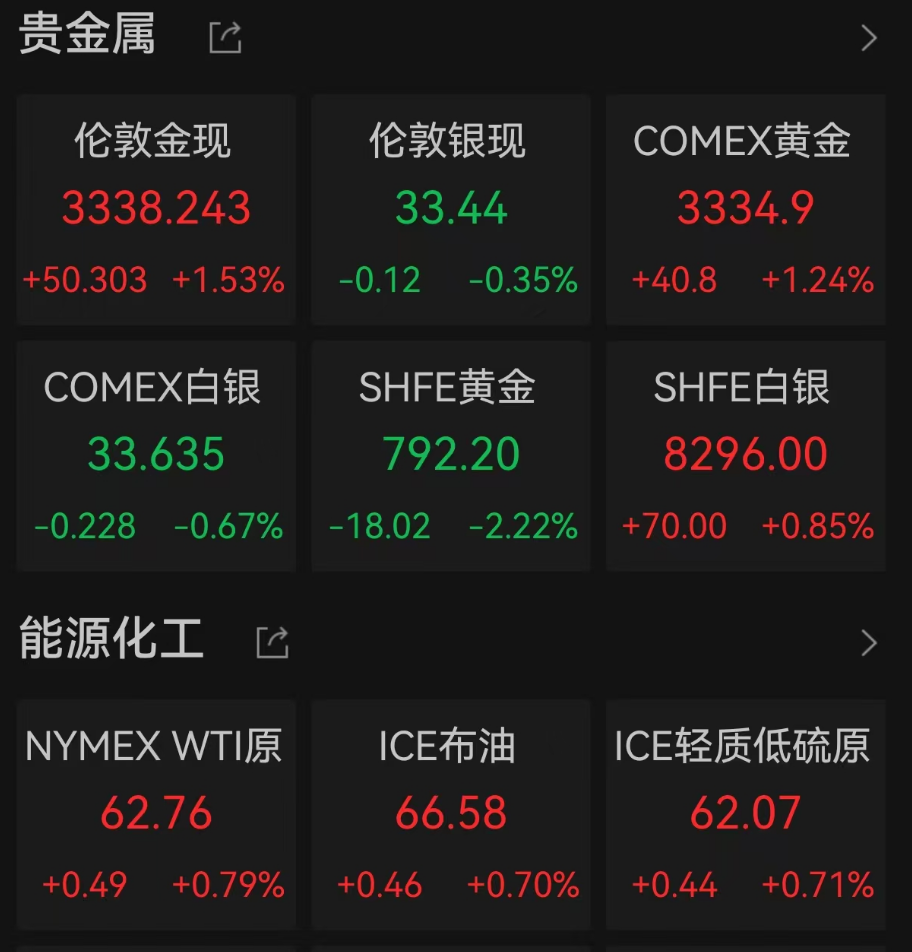 截至22:49,COMEX黄金期货主力合约上涨1.30%,重新站上3300美元/盎司关口,报3336.8美元/盎司;NYMEX原油期货及ICE布油期货主力合约上涨近1%。