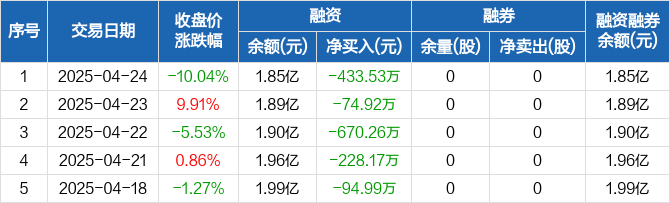 江苏吴中融资融券信息显示,2025年4月24日融资净偿还433.53万元;融资余额1.85亿元,创近一年新低,较前一日下降2.29%。