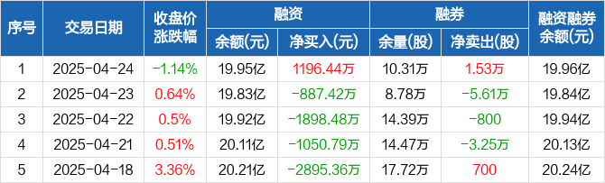 融资方面,当日融资买入3925.84万元,融资偿还2729.4万元,融资净买入1196.44万元。融券方面,融券卖出4.48万股,融券偿还2.95万股,融券余量10.31万股,融券余额143.31万元。融资融券余额合计19.96亿元。