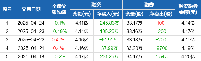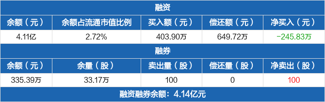 融资方面,当日融资买入403.9万元,融资偿还649.72万元,融资净偿还245.83万元,连续8日净偿还累计1567.89万元。融券方面,融券卖出100股,融券偿还0股,融券余量33.17万股,融券余额335.39万元。融资融券余额合计4.14亿元。