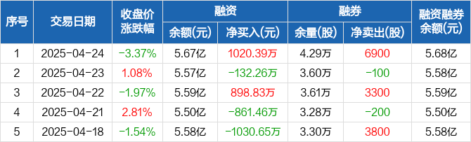 融资方面,当日融资买入6482.7万元,融资偿还5462.31万元,融资净买入1020.39万元。融券方面,融券卖出6900股,融券偿还0股,融券余量4.29万股,融券余额27.07万元。融资融券余额合计5.68亿元。