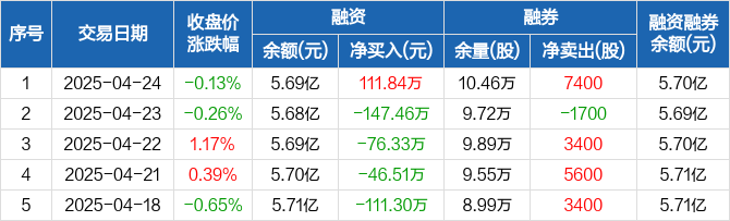 融资方面,当日融资买入526.89万元,融资偿还415.05万元,融资净买入111.84万元。融券方面,融券卖出7800股,融券偿还400股,融券余量10.46万股,融券余额80.77万元。融资融券余额合计5.7亿元。