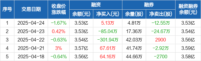 融资方面,当日融资买入576.2万元,融资偿还571.07万元,融资净买入5.13万元。融券方面,融券卖出0股,融券偿还12.55万股,融券余量4.81万股,融券余额22.66万元。融资融券余额合计3.53亿元。