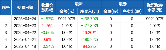 中重科技融资融券信息显示,2025年4月24日融资净偿还138.7万元;融资余额9921.97万元,较前一日下降1.38%。