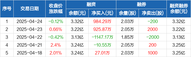 融资方面,当日融资买入1540.79万元,融资偿还556.5万元,融资净买入984.29万元。融券方面,融券卖出0股,融券偿还200股,融券余量2.03万股,融券余额33.86万元。融资融券余额合计3.32亿元。