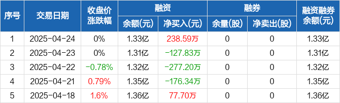 融资方面,当日融资买入568.87万元,融资偿还330.28万元,融资净买入238.59万元。融券方面,融券卖出0股,融券偿还0股,融券余量0股,融券余额0元。融资融券余额合计1.33亿元。