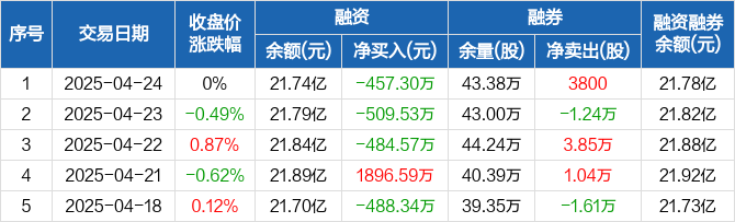 融资方面,当日融资买入1804.4万元,融资偿还2261.69万元,融资净偿还457.3万元,连续3日净偿还累计1451.4万元。融券方面,融券卖出4600股,融券偿还800股,融券余量43.38万股,融券余额349.21万元。融资融券余额合计21.78亿元。