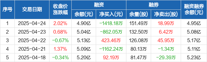 融资方面,当日融资买入3666.52万元,融资偿还5084.69万元,融资净偿还1418.18万元。融券方面,融券卖出20.07万股,融券偿还1.08万股,融券余量151.49万股,融券余额459.02万元。融资融券余额合计4.95亿元。