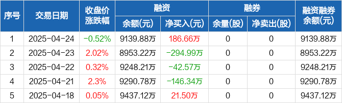 融资方面,当日融资买入303.43万元,融资偿还116.77万元,融资净买入186.66万元。融券方面,融券卖出0股,融券偿还0股,融券余量0股,融券余额0元。融资融券余额合计9139.88万元。