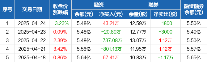 融资方面,当日融资买入2624.43万元,融资偿还2581.22万元,融资净买入43.21万元。融券方面,融券卖出3100股,融券偿还4900股,融券余量12.59万股,融券余额135.85万元。融资融券余额合计5.5亿元。