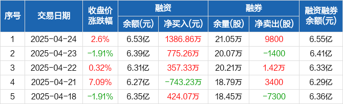 融资方面,当日融资买入4511.85万元,融资偿还3124.99万元,融资净买入1386.86万元,连续3日净买入累计2519.45万元。融券方面,融券卖出1.04万股,融券偿还600股,融券余量21.05万股,融券余额199.13万元。融资融券余额合计6.55亿元。