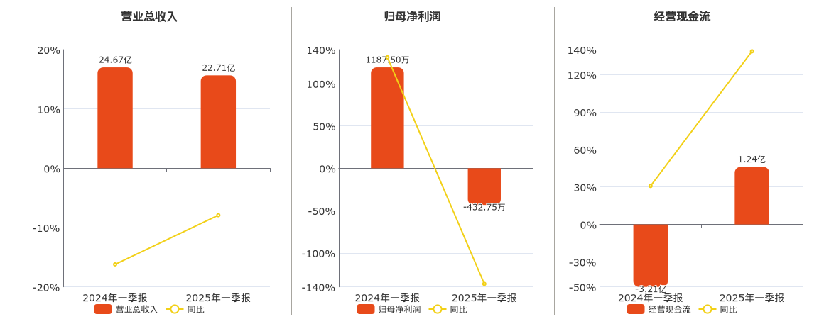公司营业总收入为22.71亿元,较去年同报告期营业总收入减少1.95亿元,同比较去年同期下降7.92%。归母净利润为-432.75万元,较去年同报告期归母净利润减少1620.25万元,同比较去年同期下降136.44%。经营活动现金净流入为1.24亿元,较去年同报告期经营活动现金净流入增加4.45亿元,实现2年连续上涨。