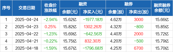 融资方面,当日融资买入4792.71万元,融资偿还6769.89万元,融资净偿还1977.18万元。融券方面,融券卖出3600股,融券偿还600股,融券余量4.62万股,融券余额359.9万元。融资融券余额合计15.66亿元。