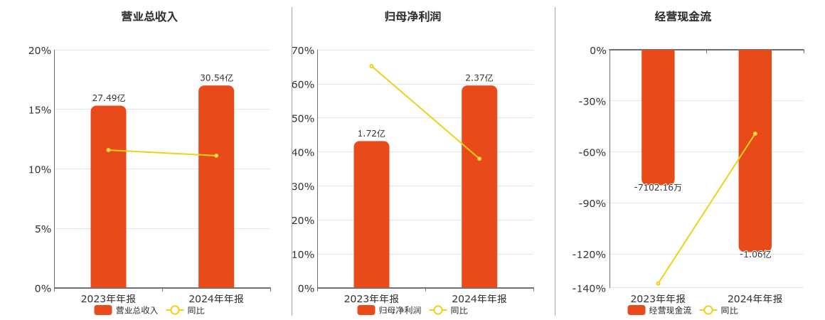 公司营业总收入为30.54亿元。归母净利润为2.37亿元。经营活动现金净流入为-1.06亿元,在已披露的同业公司中排名第152,较去年同报告期经营活动现金净流入减少3505.97万元。
