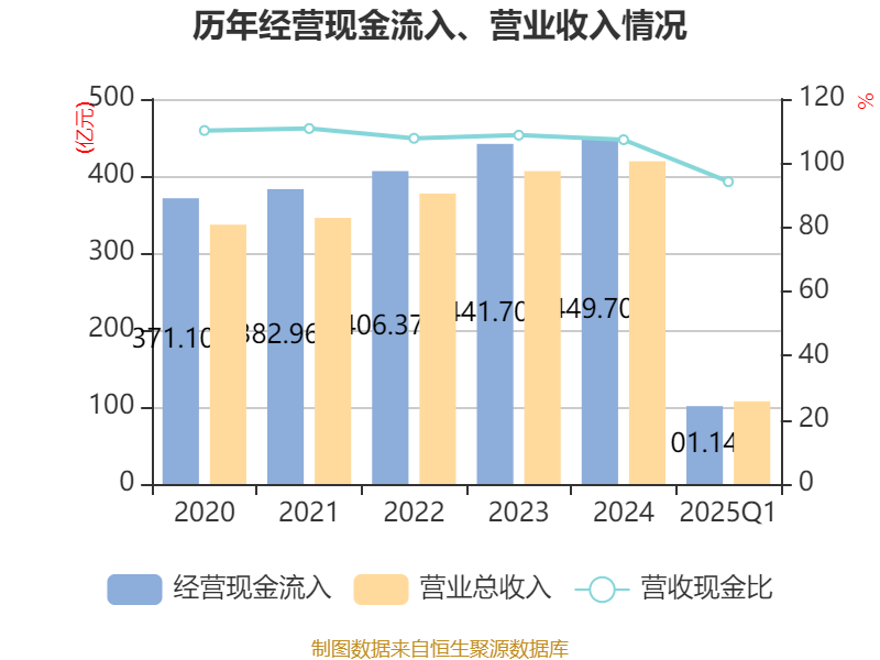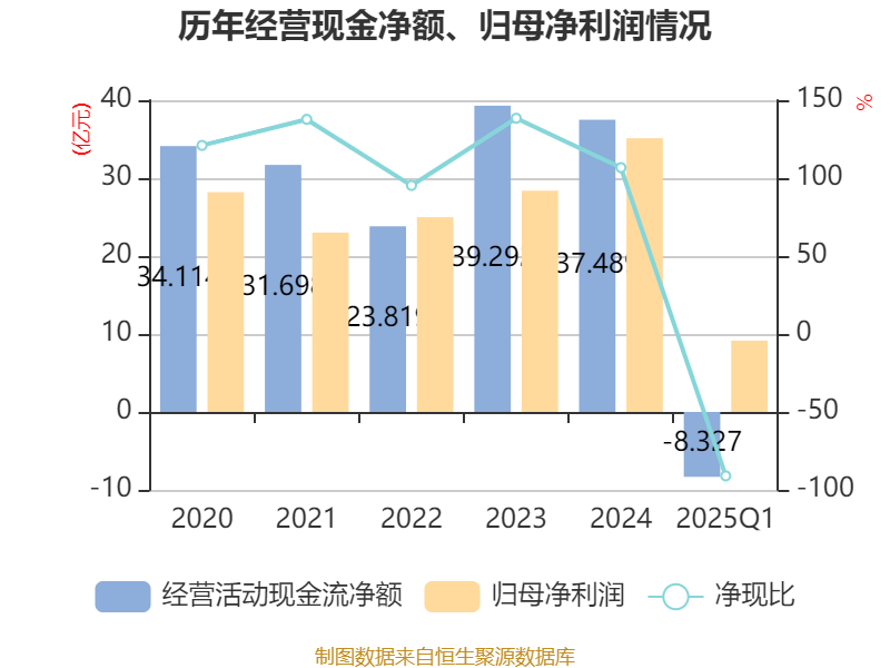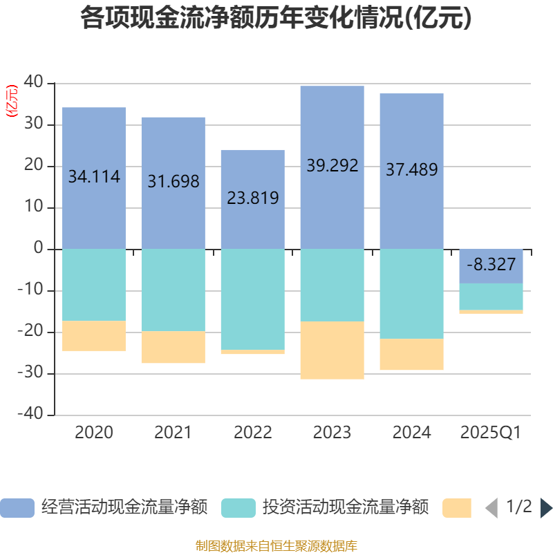 截至2025年一季度末,公司经营活动现金流净额为-8.33亿元,同比减少3.48亿元;筹资活动现金流净额-8683.86万元,同比减少1.58亿元;投资活动现金流净额-6.46亿元,上年同期为-7.07亿元。