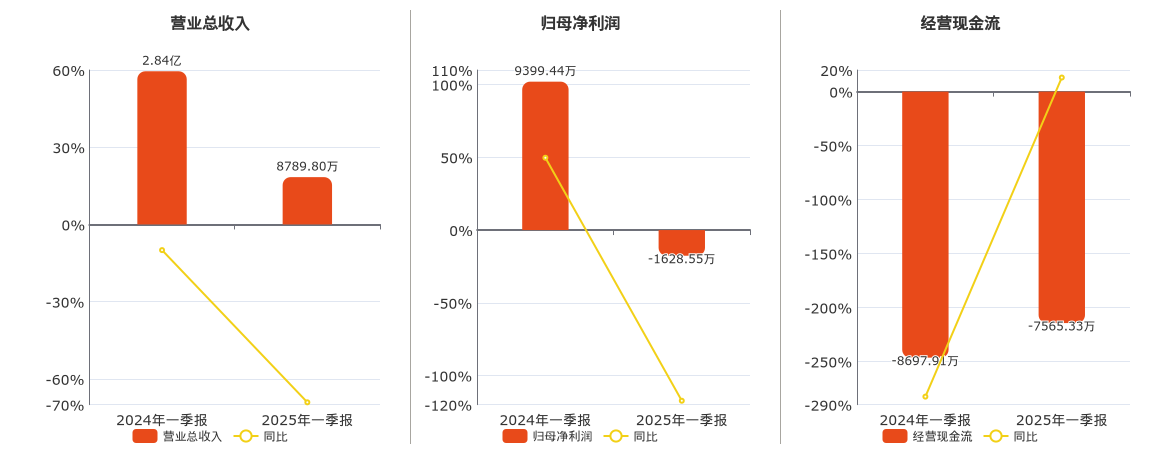 公司营业总收入为8789.80万元,较去年同报告期营业总收入减少1.97亿元,同比较去年同期下降69.10%。归母净利润为-1628.55万元,较去年同报告期归母净利润减少1.10亿元,同比较去年同期下降117.33%。经营活动现金净流入为-7565.33万元。