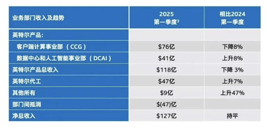 当天凌晨,英特尔公布了2025财年第一财季财报。报告显示,英特尔第一财季营收为127亿美元,与上年同期的127亿美元相比持平;应占净亏损为8亿美元,与上年同期的应占净亏损4亿美元相比扩大115%,不按照美国通用会计准则的调整后应占净利润为6亿美元,与上年同期的8亿美元相比下降24%。