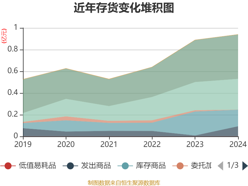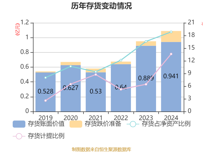 从存货变动来看,截至2024年末,公司存货账面价值为9407.76万元,占净资产的18.84%,较上年末增加520.61万元。其中,存货跌价准备为1482.49万元,计提比例为13.61%。