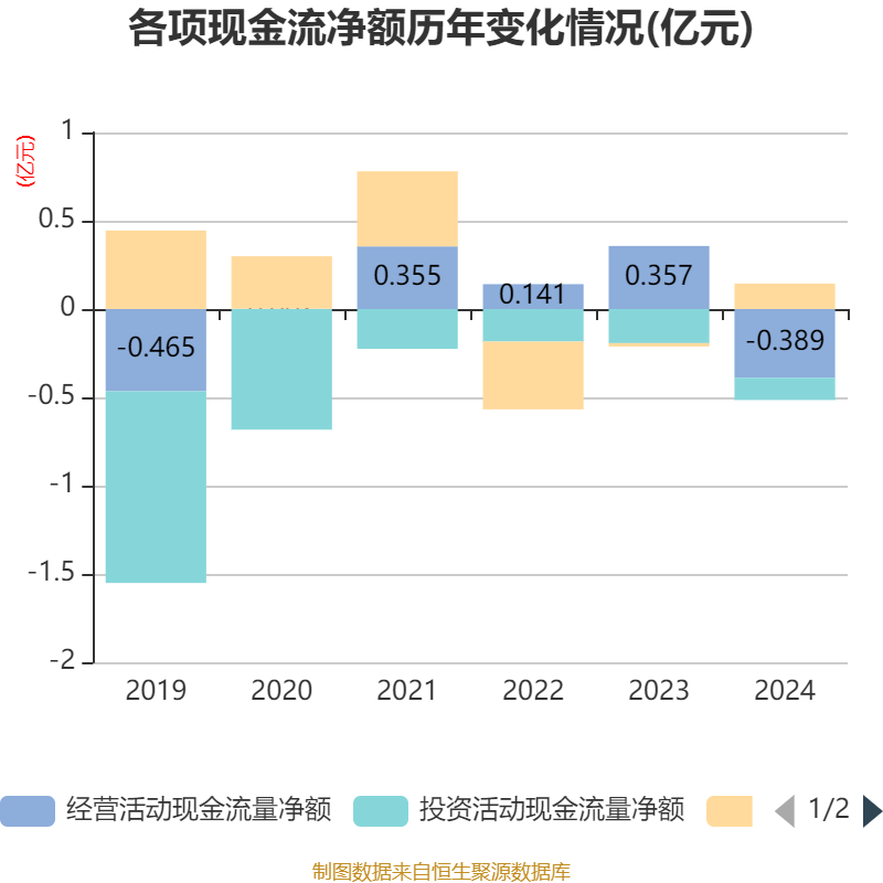 截至2024年,公司经营活动现金流净额为-3886.1万元,同比减少7456.8万元;筹资活动现金流净额1436.57万元,同比增加1624.54万元;投资活动现金流净额-1264.33万元,上年同期为-1932.54万元。