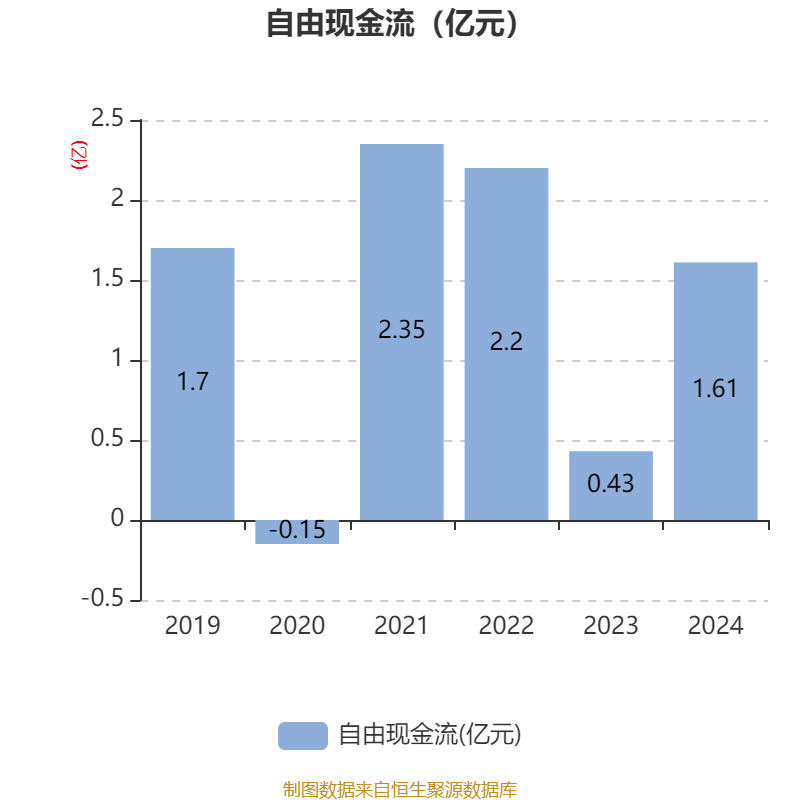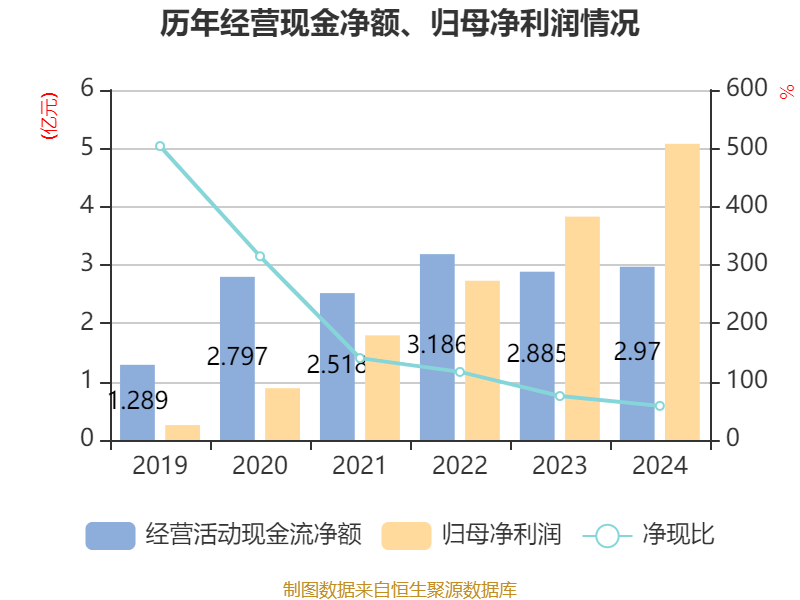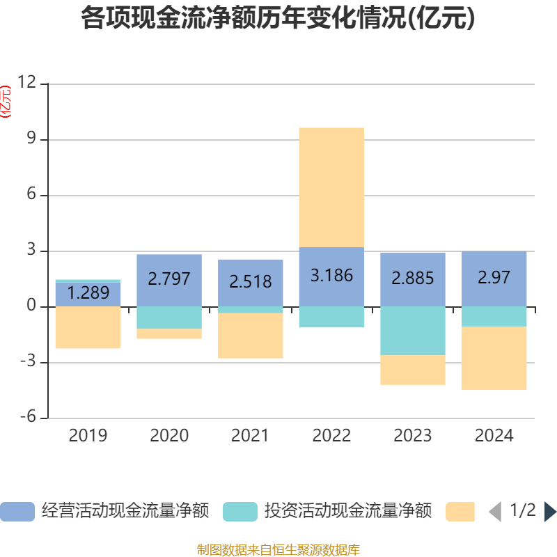 截至2024年,公司经营活动现金流净额为2.97亿元,同比增长2.98%;筹资活动现金流净额-3.39亿元,同比减少1.8亿元;投资活动现金流净额-1.1亿元,上年同期为-2.64亿元。
