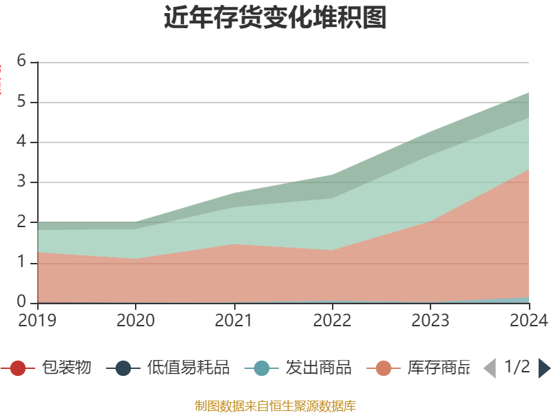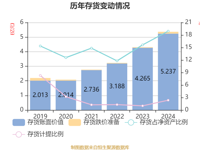 从存货变动来看,截至2024年末,公司存货账面价值为5.24亿元,占净资产的18.92%,较上年末增加9722.83万元。其中,存货跌价准备为1261.1万元,计提比例为2.35%。