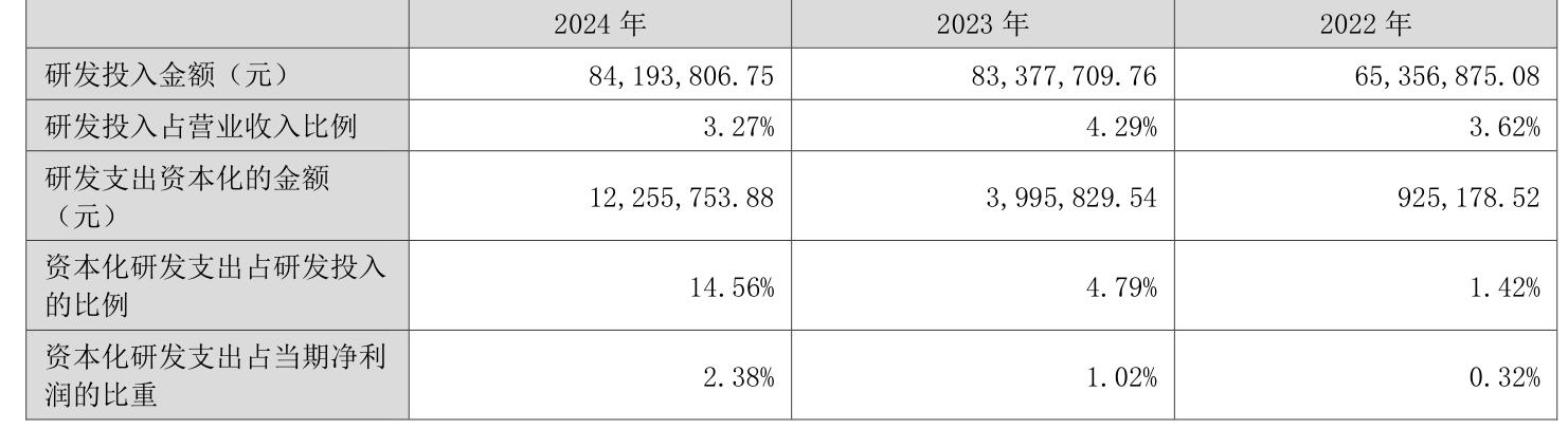 2024年全年,公司研发投入金额为8419.38万元,同比增长0.98%;研发投入占营业收入比例为3.27%,相比上年同期下降1.02个百分点。此外,公司全年研发投入资本化率为14.56%。