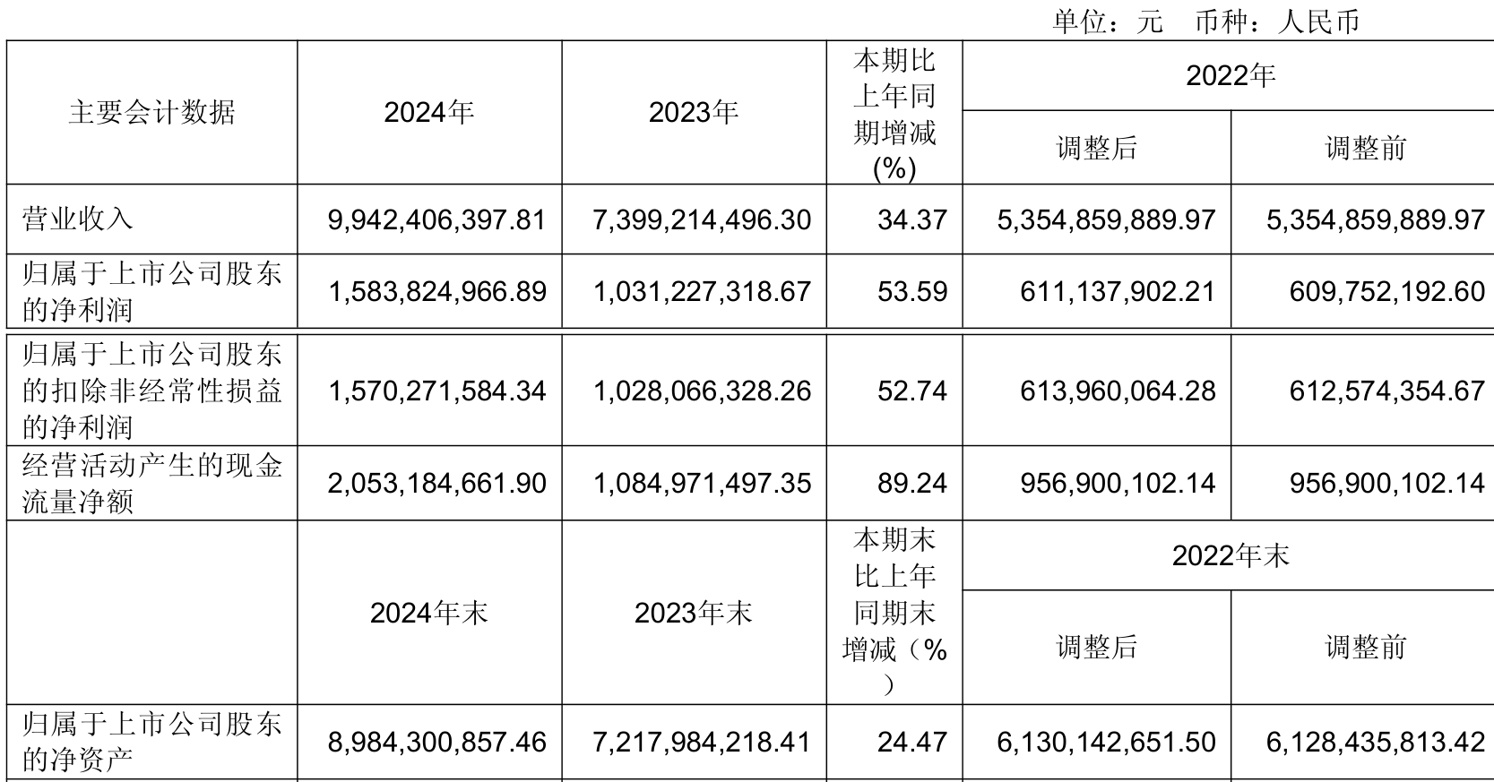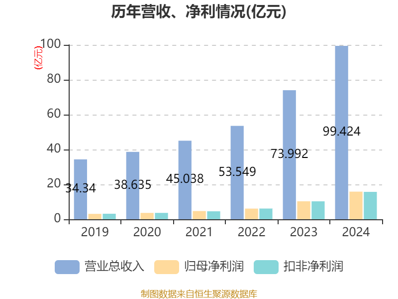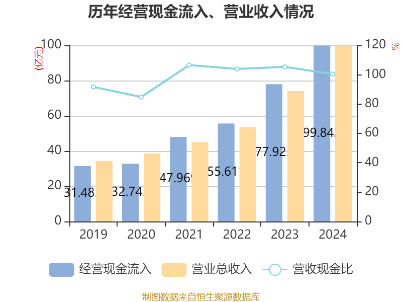 中证智能财讯金诚信(603979)4月25日披露2024年年度报告。2024年,公司实现营业总收入99.42亿元,同比增长34.37%;归母净利润15.84亿元,同比增长53.59%;扣非净利润15.7亿元,同比增长52.74%;经营活动产生的现金流量净额为20.53亿元,同比增长89.24%;报告期内,金诚信基本每股收益为2.57元,加权平均净资产收益率为19.44%。公司2024年度分配预案为:拟向全体股东每10股派现4.5元(含税)。